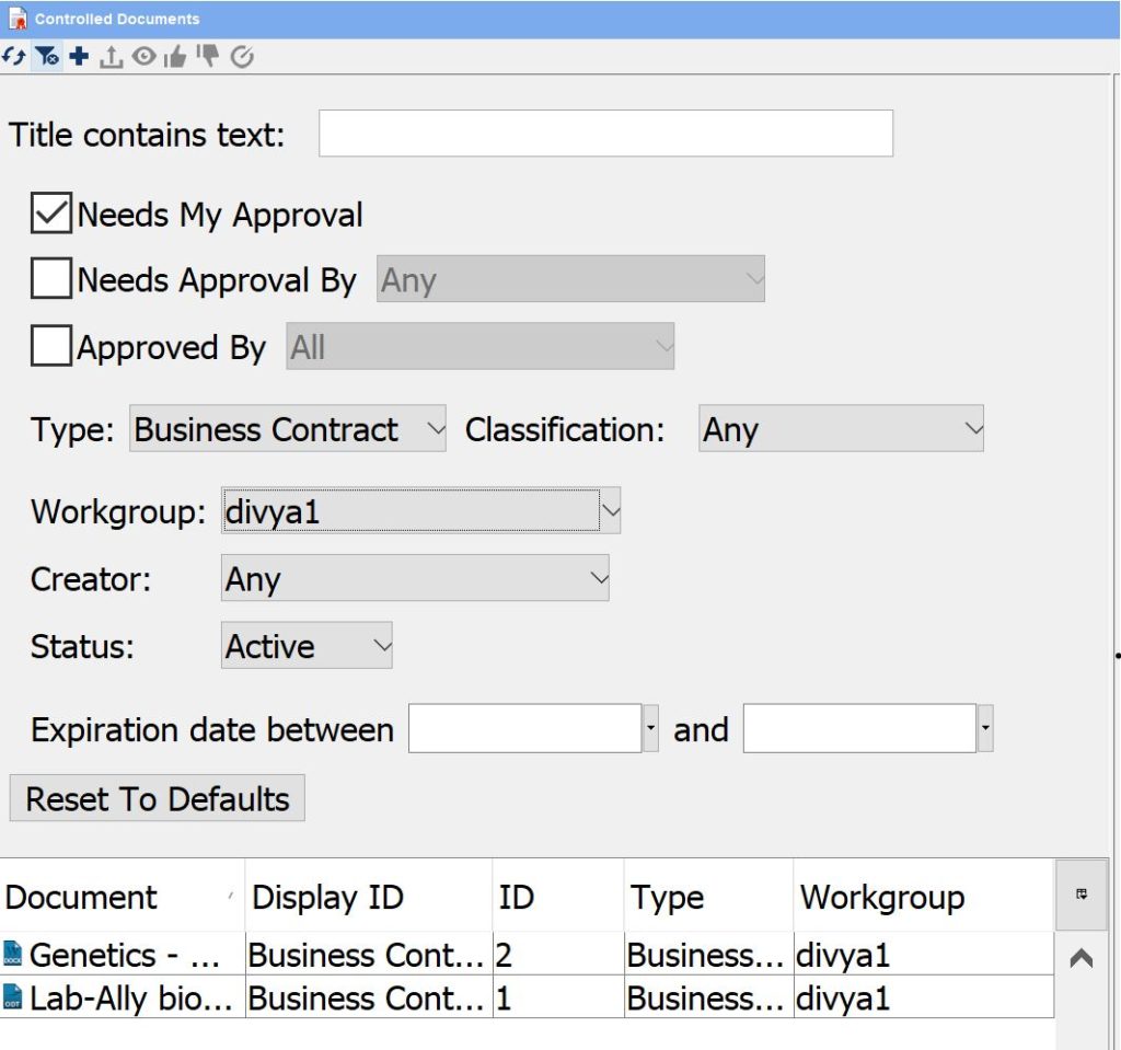 Here is an example where the user is looking for all Controlled Documents that are Business Contracts (includes NDA), need her approval and are owned by the divya1 Workgroup:
