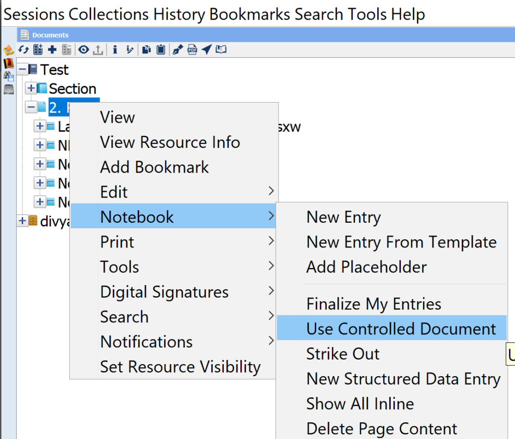 1. In the Document Tree (left panel), right-click on the Notebook Page where you want to use a Controlled document.