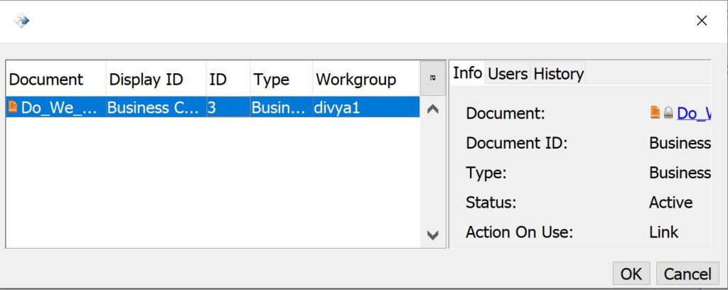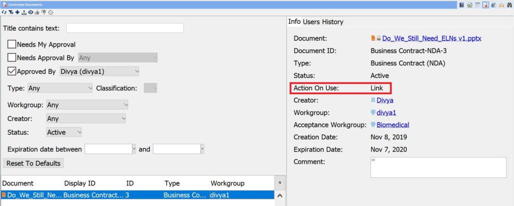 Here is an example of a Controlled Document that has been filtered to show those that have been approved by this user. Note in the info pane that “Action on Use” is Link (circled):