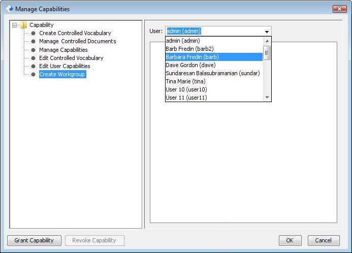 - In the Manage Capabilities dialog select a Capability from the list of Capabilities in the left pane and select the user to whom you are granting this privilege from the drop-down list of users.