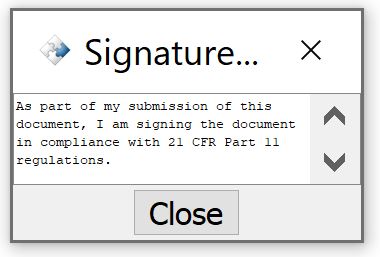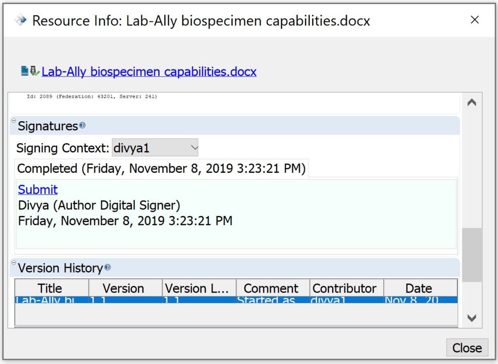 As soon as signatures have been initiated, the Signatures pane is dynamically created in the Info panel or Info dialog. Select the signed resource in the Document Tree and click the Info button to see the Signature Block. It shows the completed signature and pending signatures and will be updated as Cosigners complete, reject, or cancel the signature workflow. Note that scanned signatures may be added by the System Admin, but these are not necessary as the signature block shows the Signer’s name, role, and time and date (this information cannot be altered).