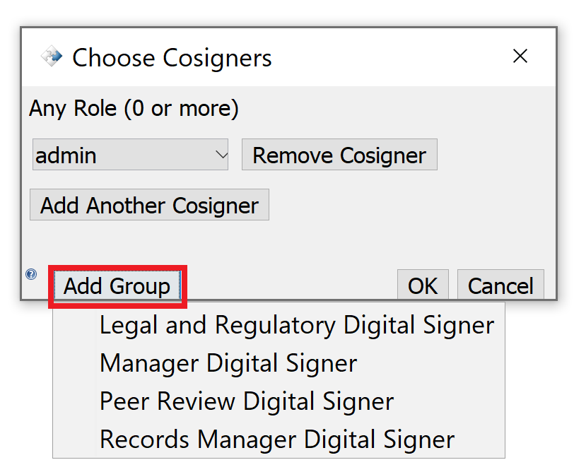 If there is more than one cosigner available for each required role, select a cosigner from the drop-down list. Note that members of a signature group can have multiple signing roles. Note that you can also add a Group (circled below). This is optional. Click OK.