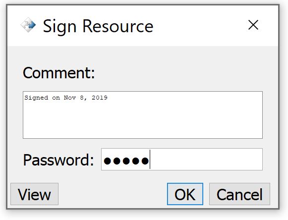 This opens the Sign Resource dialog. Type in a comment (optional) and your digital signature password. Click OK.