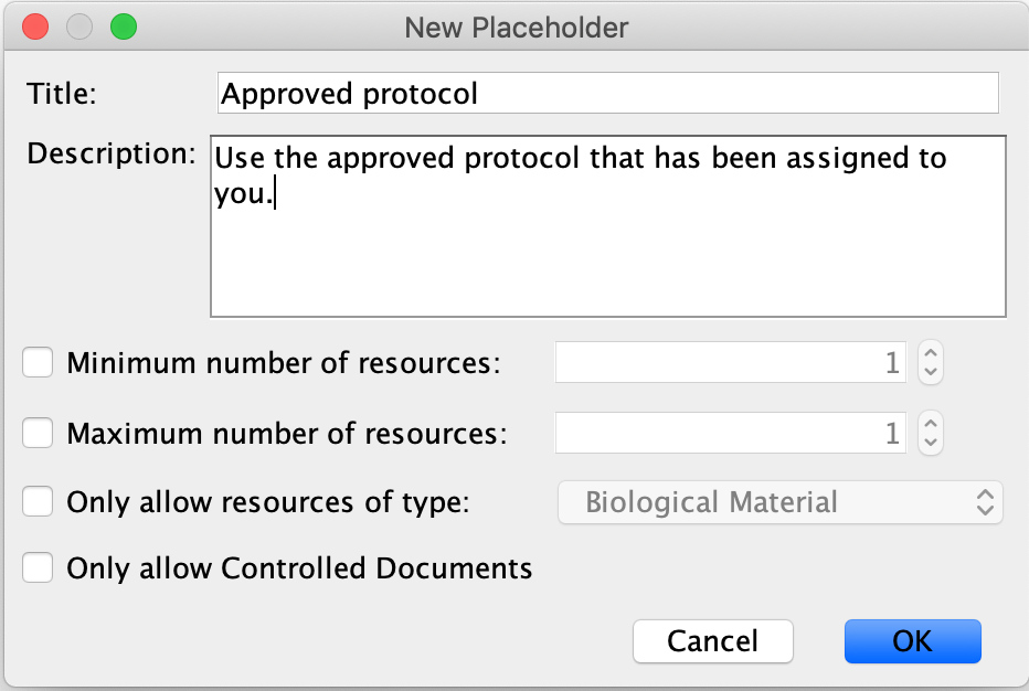 A placeholder can be created on a Notebook Page to indicate the point of insertion for a file or files that are to be added at a later time. The placeholder can optionally specify the number of files (maximum and minimum) to be added and the Resource Type. A placeholder can also be used to indicate that a controlled document needs to be inserted. As an example, this can be used to force a user to select an approved protocol that has been assigned to them and that they are approved to use, and insert it into a notebook page placeholder as part of a specific workflow.