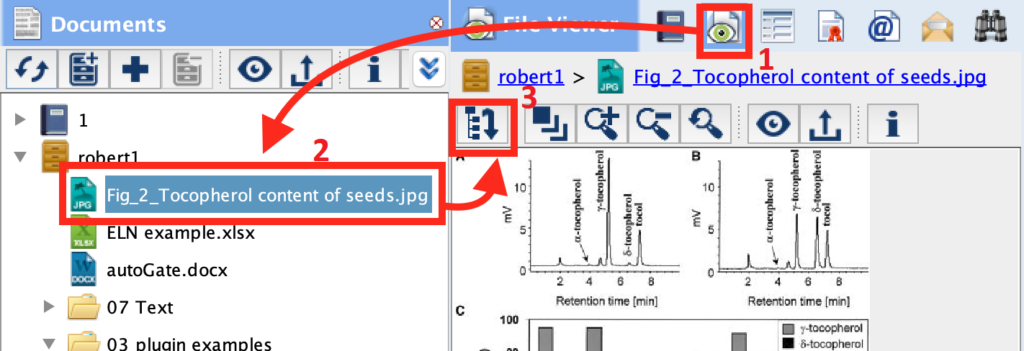 You can also click on the File Viewer icon in the middle panel selector toolbar (1), click on the file cabinet, folder or file you would like to view (2), and click the load selected resource icon (3) to load that resource in the file center viewer pane.