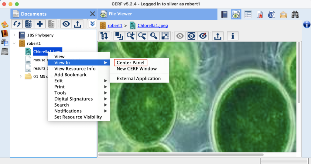 Like everything else in CERF, the File Viewer will only allow you to see files for which you have an appropriate access role. Users with a role of “Resource Identifier”, will not be able to view files and will not see the associated right click View commands.