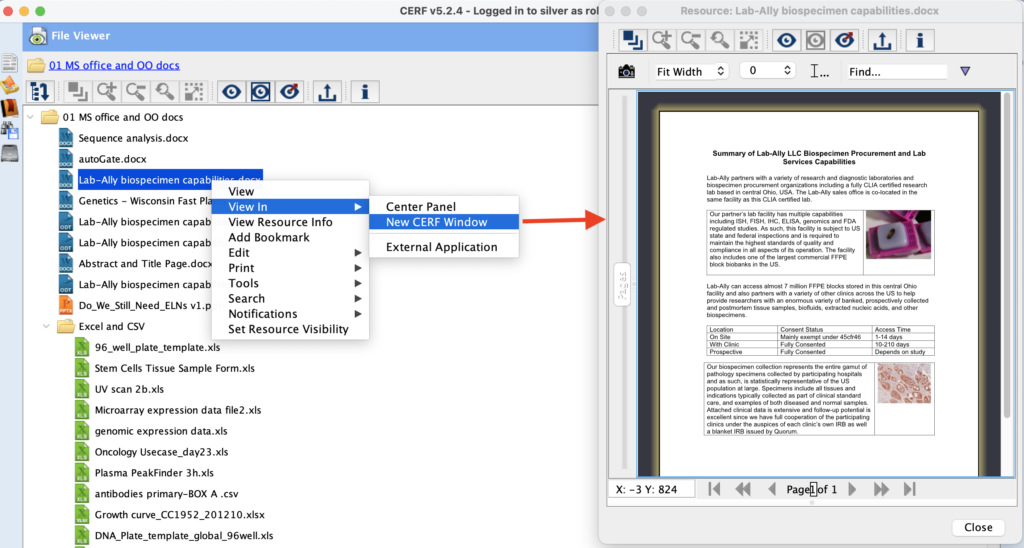 To open a file in a separate file viewer window: Right click on the file and select View In > New CERF Window. The file will open in a separate window.