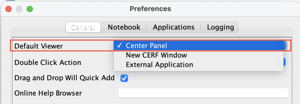The Center Panel File Viewer is the default choice when you view a file in CERF, clicking the view icon will open the file in the file viewer center panel. You can adjust the default view mode preference in the settings / options area: