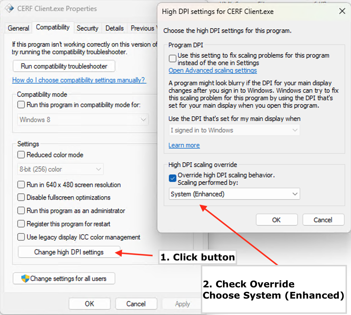 The user can override the High DPI settings compatibility mode for CERF Desktop application separately. (Note: the user may need an IT Administrator to adjust these settings)