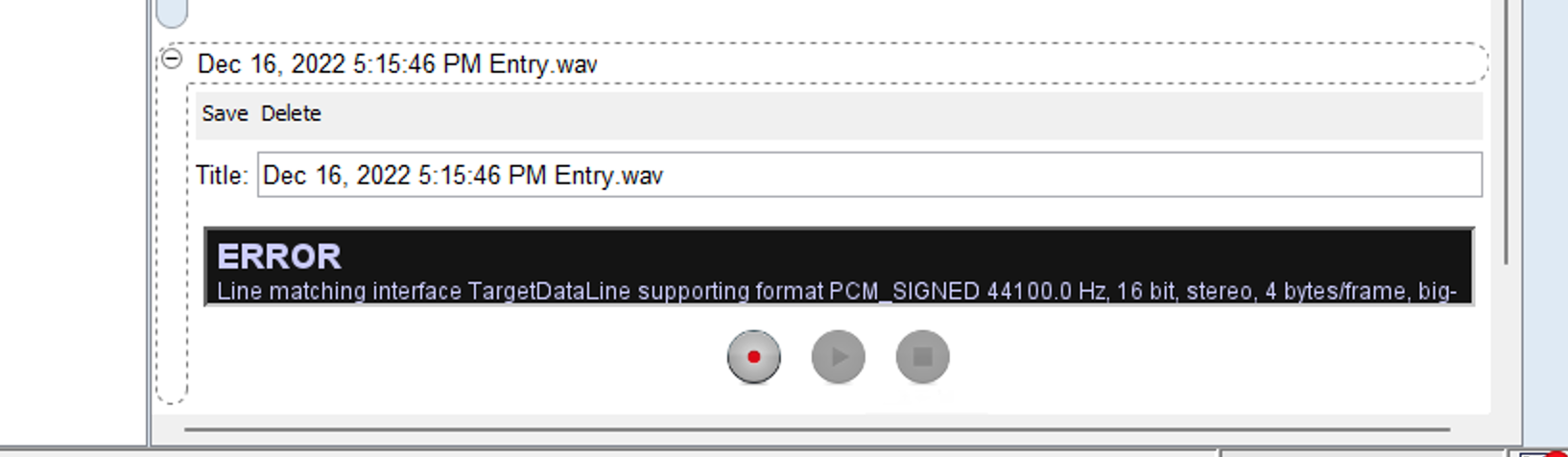 When adding a new Audio Entry to a Notebook Page, I get an error message in the entry stating “Error Line matching interface TargetDataLine supporting format PCM_SIGNED 44100.0 Hz, 16 bit, stereo, 4 bytes/frame, big-…” How do i fix this issue?