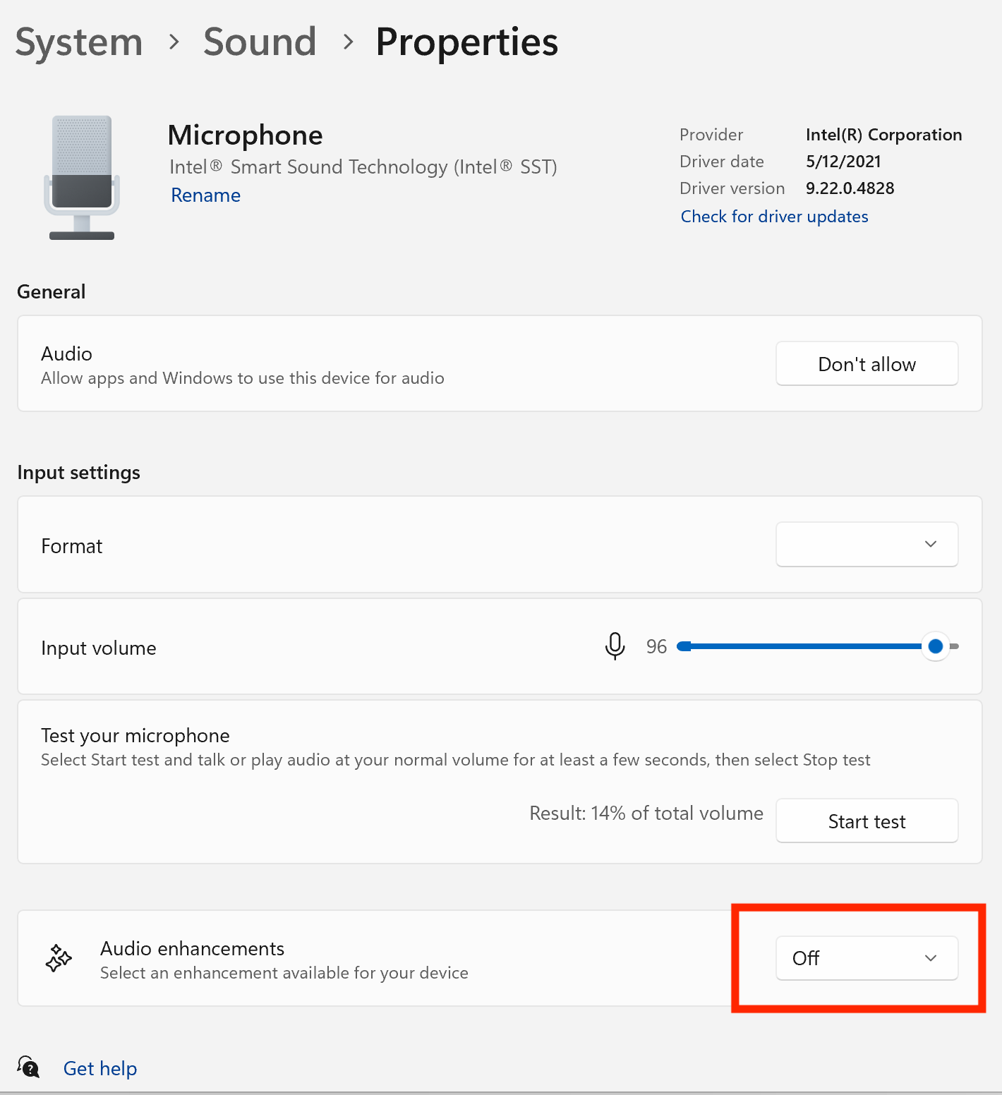 For Windows 11 users, you can also check the settings for your Sound under System > Sound > Properties. Test the audio settings there, as well as check the setting for Audio Enhancements and turn them Off (or On to see if a difference).